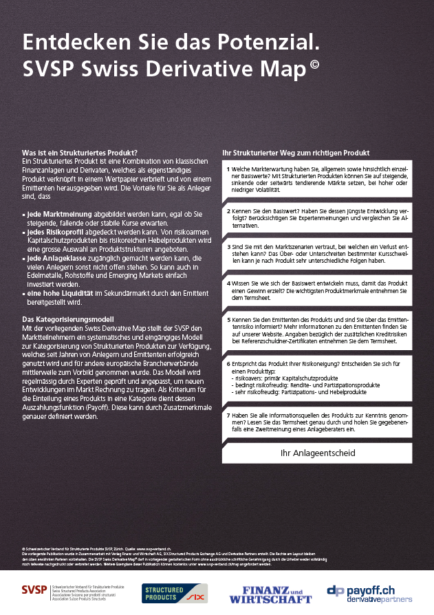 Die vom Verband definierten Produkttypen sind auf der Swiss Derivative Map übersichtlich aufgeführt. Die Map kann als Faltprospekt kostenlos bezogen werden und wurde in Zusammenarbeit mit payoff.ch (Derivative Partners), der Finanz- und Wirtschaft und dem SSPA produziert. Bestellen Sie hier.