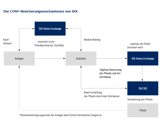 Gestützt auf den Rahmenvertrag verpflichtet sich der Sicherungsgeber, die COSI®-Produkte mit Pfand zu besichern. Sowohl die COSI®-Produkte als auch die Sicherheiten werden an jedem Bankwerktag bewertet. Der Sicherungsgeber ist verpflichtet, die Höhe der Besicherung allfälligen Wertveränderungen laufend anzupassen. Sollte während der Laufzeit des COSI®-Produkts ein vertraglich definierter Verwertungsfall eintreten (z.B. im Insolvenzfall des Emittenten), leitet SIX umgehend die Verwertung des Pfands ein und kümmert sich um die Auszahlung der Anleger.