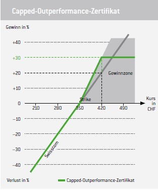 Bis zum Cap von 420 CHF partizipiert der Anleger mit 150 Prozent. Würde der Basiswert um 20 Prozent steigen, hätte der Anleger einen Gewinn von 30 Prozent. Der Gewinn kann allerdings nicht höher als der Cap ausfallen. Demnach bliebe der Gewinn auch bei 30 Prozent (Cap), wenn der Basiswert um 40 Prozent steigen würde.