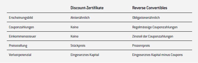 Diese Coupons fallen deutlich höher als das Niveau am Obligationenmarkt aus. Reverse Convertibles haben jedoch ein höheres Risiko als Obligationen, da die Nominalwertrückzahlung nicht garantiert ist. Die wichtigsten Unterschiede im Überblick: