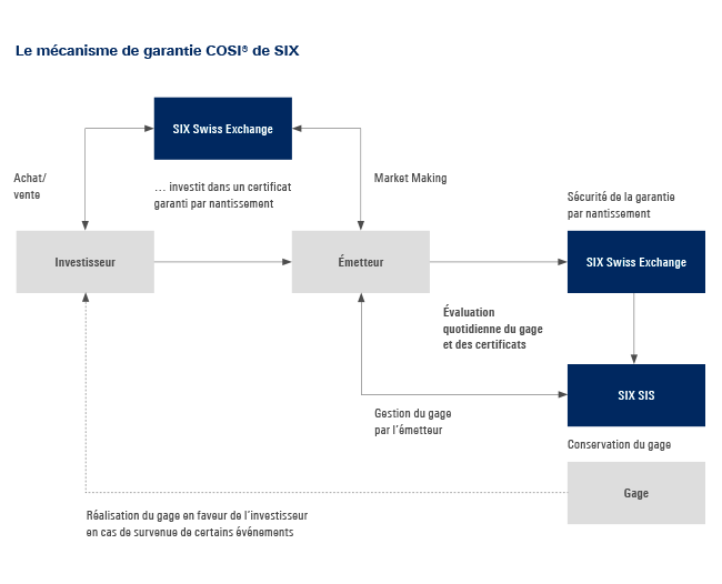 Le donneur de sûretés s'engage, sur la base du contrat-cadre, à octroyer à SIX Swiss Exchange un droit de gage basé sur des garanties sélectionnées. Les certificats garantis par nantissement et les sûretés sont évalués à chaque jour ouvrable bancaire, le donneur de sûretés étant tenu d'adapter le montant de la garantie aux éventuelles fluctuations de valeur. Si pendant la durée du produit COSI®, un événement de liquidation se produit (par exemple en cas d'insolvabilité de l'émetteur), SIX va liquider les sûretés et prendre soin de paiement aux investisseurs.