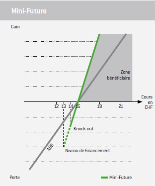 Avec plus de 600 produits recensés, les Mini- Futures constituent un investissement de plus en plus apprécié en Suisse. Par rapport aux Warrants, les Mini-Futures présentent les mêmes particularités que les produits Knock-out. Ce sont des produits open end, c’est-à-dire qu‘ils ont une durée de vie illimitée. Lorsque la barrière knock-out est atteinte ou franchie, le produit arrive à échéance et est liquidé par l’émetteur. L’investisseur touche alors la valeur résiduelle.
