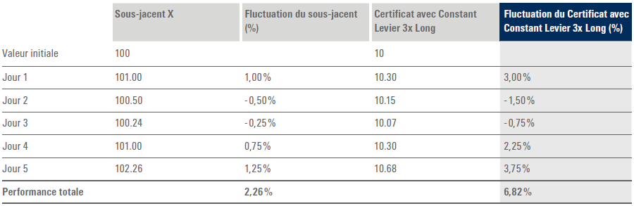 Un investisseur prévoit une hausse du cours d'un sousjacent. Il achète alors un Certificat avec Constant Levier 3x Long et participe ainsi aux variations de cours du sous-jacent avec un facteur 3. Le tableau ci-après illustre le comportement sur 5 jours. Important: pour une période de plus d'une journée, la performance du sous-jacent ne peut être tout simplement multipliée avec le facteur 3, car, dans les Certificats avec Constant Levier, c'est à chaque fois le cours de la journée précédente qui constitue la nouvelle base de calcul («Resetting»).