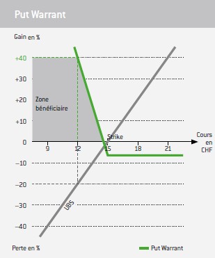 Un Put Warrant garantit le droit de vendre un sous-jacent déterminé à un prix déterminé dans une quantité déterminée pendant une période déterminée. Ce droit prend de la valeur lorsque le prix du sous-jacent baisse. Les détenteurs de Put Warrants tirent donc profit des baisses de cours.
