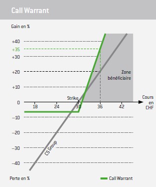 Le rapport de souscription de 0,1 signifie qu’un Warrant représente 0,1 unité du sous-jacent. Les Warrants ont généralement de faibles rapports de souscription afin qu’ils ne soient pas trop chers et qu’ils soient aisément fractionnables même en cas de faibles montants de placement. Dans le cas qui nous occupe, vous pourriez, pendant les deux prochaines années, acquérir avec 10 Warrants une action Credit Suisse au prix de 30 CHF (cours d’exercice), quel que soit le cours de l’action au moment de l’achat. Il semble logique que ce droit ait d’autant plus de valeur que la cotation de l’action est élevée. Si l’action montait à 36 CHF, ce Warrant prendrait une valeur d’environ 1,70 CHF. Ultérieurement, vous pourrez effectuer de tels calculs de scénarios à l’aide du calculateur que nous proposons sur www.six-structured-exchange.com. Le Warrant aurait donc progressé de près de 35 pour cent tandis que l’action aura augmenté «d’à peine» 20 pour cent.