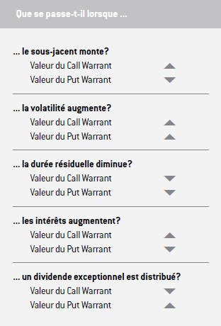 Le cours d’un Warrant n’est pas uniquement déterminé par le cours du sous-jacent. D’autres facteurs entrent en ligne de compte. L’investisseur doit en particulier attacher beaucoup d’importance aux variations de la volatilité, c’est-à-dire à la marge de fluctuation du sous-jacent. Les modifications du niveau des intérêts ainsi que des dividendes attendus jouent également un rôle.