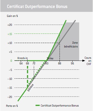 Si le cours est supérieur au prix d’exercice à la date d'échéance, l'investisseur participe au gain de cours du sous-jacent à hauteur de 150 pour cent. Si le sous-jacent s’apprécie de 10 pour cent, le rendement s’établit à 15 pour cent. Si le cours de clôture est inférieur au prix d’exercice, le remboursement dépendra du franchissement du seuil de sécurité. Si ce n’est pas le cas, le remboursement sera équivalent au Bonus-level, en l’occurrence 80 CHF. Sinon, le sous-jacent sera directement livré sur le dépôt de l’investisseur qui supportera donc intégralement la perte de cours du sous-jacent.