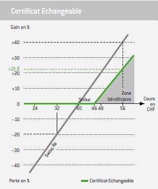 Comme pour tous les autres produits de protection du capital, le remboursement des Certificats Echangeables est garanti à hauteur de la protection du capital. L’investisseur profite de manière illimitée des gains de cours réalisés au-delà du prix d’exercice. Ce produit structuré n’est donc pas plafonné. Si le cours clôture au-dessus du prix d’exercice à la date d’échéance, le certificat est automatiquement converti dans le sous-jacent correspondant. La prime de conversion est déterminée au début et fixe donc le prix de conversion (prix d’exercice) après la souscription du certificat.