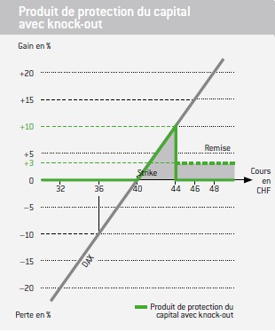Il existe deux légères variantes de produits de protection du capital avec knock-out (barrière désactivante). En principe, l’investisseur participe intégralement à la hausse des cours jusqu’au seuil knock-out. Le franchissement du seuil fait expirer l’option sans valeur et supprime la participation aux gains de cours. Dans l’une des deux variantes, l'investisseur perçoit une remise dès que le seuil knock-out est atteint. Bien qu’il ne participe plus aux gains de cours, il reçoit tout de même un paiement fixe supplémentaire à la date d’échéance.