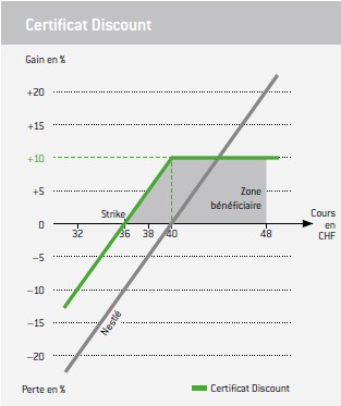 Les Certificats Discount permettent d’acheter un sous-jacent avec un rabais (discount). Par conséquent, l’investisseur obtient le certificat à un prix inférieur au cours actuel du sous-jacent. En contrepartie, le gain maximal possible est limité à un plafond (cap) déterminé. Le rabais sera d’autant plus élevé que le plafond sera bas. Les Certificats Discount sont généralement dotés d’une durée de vie d’un à trois ans.