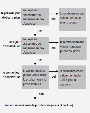 A l’émission, les Certificats Express classiques ont généralement une durée maximale de trois à six ans. Une date d’observation est fixée pour chaque année. Si, à la date d’observation, le sous-jacent atteint ou dépasse un seuil déterminé, le certificat arrive prématurément à échéance. Dans ce cas, l’investisseur bénéficie d’un remboursement anticipé. Les rendements annuels sont généralement compris entre 5 et 8 pour cent. Si, à la date d’observation, la cotation est inférieure au seuil fixé, le certificat continue à courir jusqu’à la date d’observation suivante. Si le seuil requis n’est atteint à aucune des dates d’observation, l’investisseur se voit généralement rembourser le prix d’émission pour autant que le sous-jacent ne soit jamais descendu en deçà d’un seuil de sécurité défini. Si ce seuil a été franchi, l’investisseur est susceptible de subir une perte à l’échéance.