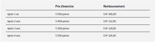 Ce Certificat Express est un produit dont le prix d’exercice diminue chaque année. Au terme de la première année, on vérifie si le SMI atteint ou dépasse le prix d’exercice de 5'500 points à la date de référence. Si tel est le cas, le certificat arrive à échéance prématurément et l’investisseur se voit rembourser 106 CHF. Sinon, le certificat continue à courir jusqu’à la date de référence suivante. Ici, l’investisseur recevrait 112 CHF si le SMI atteignait ou dépassait 5'400 points. Si l’indice n’atteint ni ne franchit le prix d’exercice défini à aucune des dates de référence, l’investisseur reçoit à l’échéance le prix d’émission de 100 CHF, pour autant que l’indice ne soit jamais descendu en dessous du seuil de sécurité de 4'500 points. Sinon, l’investisseur se voit rembourser un montant correspondant à l’évolution du sous-jacent et peut donc subir une perte.